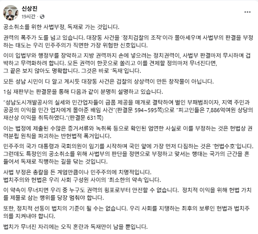 그러면서 이는 "정치권력이, 사법부 판결마저 무시하며 겁박하고 무력화하려는 것으로 모든 권력이 한 곳으로 쏠리고 이를 견제할 정의마저 무너진다면, 그 끝은 바로 ‘독재’"라고 성토했다.