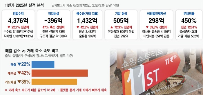 지배구조 불확실성도 해소됐다. 11번가는 2025년 10월 SK플래닛의 100% 자회사로 편입됐다. 재무투자자(FI) 지분 정리가 마무리되면서 유상증자 600억원이 유입됐고, 기말 현금은 505억원으로 전년(292억원) 대비 73% 늘었다. 부채비율도 1261%에서 450%로 급락했다.