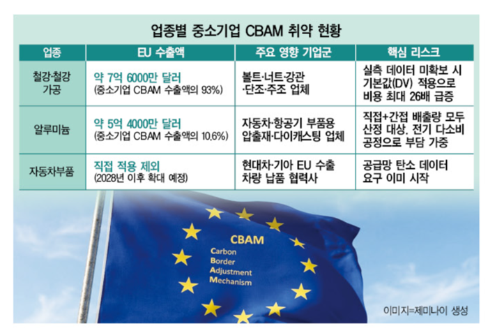 현재 CBAM 대상 국내 중소기업은 1358개사로, 이 중 EU 직접 수출기업만 약 998개사(73.5%)에 이른다. 업종별로는 철강과 철강 가공제품에 전체 수출액의 93%가 집중돼 볼트ㆍ너트ㆍ강관 제조 업체들이 가장 직접적인 타격권에 놓였다.