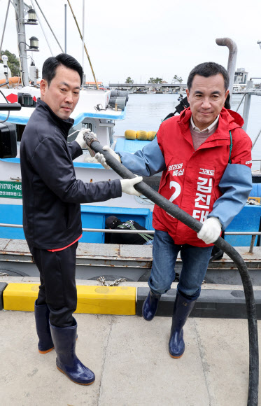 22일 강원 양양군 현남면 남애항에서 국민의힘 장동혁 당 대표(왼쪽)와 김진태 강원지사 예비후보가 어선에 경유를 급유하고 있다./사진:연합