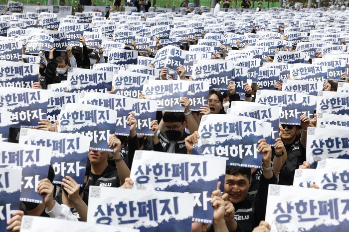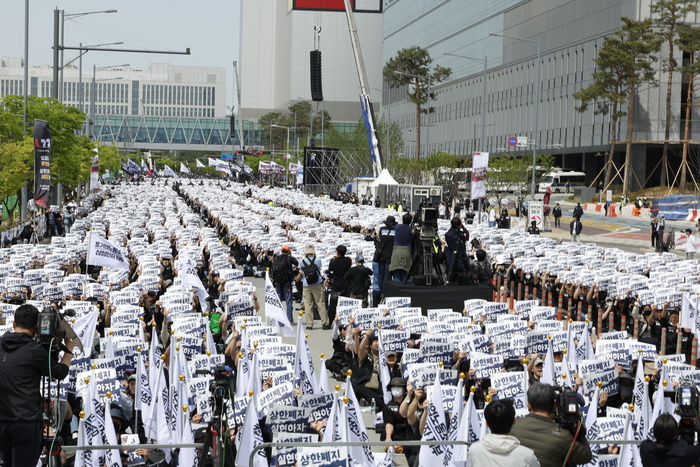 최 위원장의 투쟁사를 시작으로 조합원들은 “투장하자! 쟁취하자! 실현하자! 바로잡자!”는 구호를 연신 외쳤다. 무대 위에 오른 노조 간부들도 “정당한 보상없이 헌신없다”며 목소리를 높였고, 조합원들은 일제히 함성으로 화답했다.