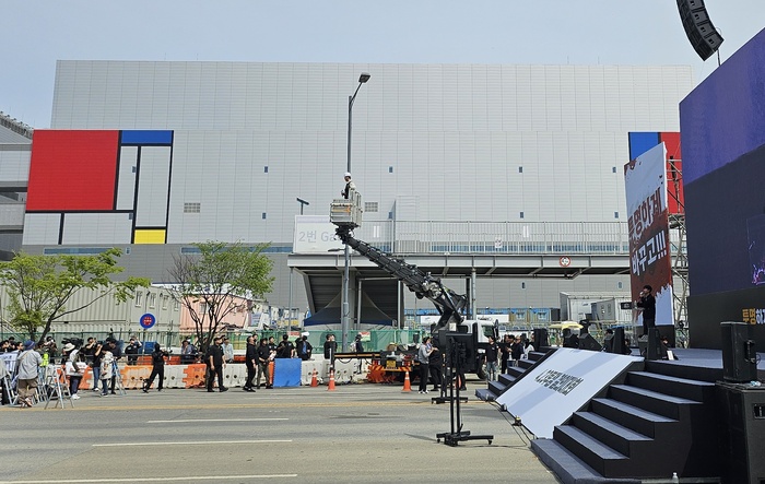 [대한경제=이근우 기자] “투명하게 바꾸고! 상한폐지 실현하자!”. 23일 오전 삼성전자 평택캠퍼스 사무복합동과 사무3동 사이 왕복 8차선 도로는 흡사 거대한 야외 물류 창고를 방불케 하는 풍경이 펼쳐졌다. 도로 한복판에 산더미처럼 쌓인 생수 팔레트, 수십명의 노조 스태프들이 물품 배정과 현장 정리에 여념이 없었다. 차량 통제, 물품 운반, 무대 설치 확인까지 일사불란하게 움직였다.