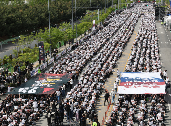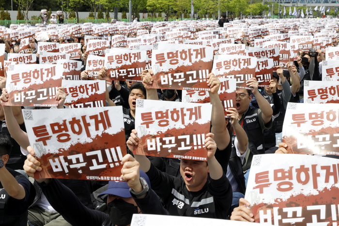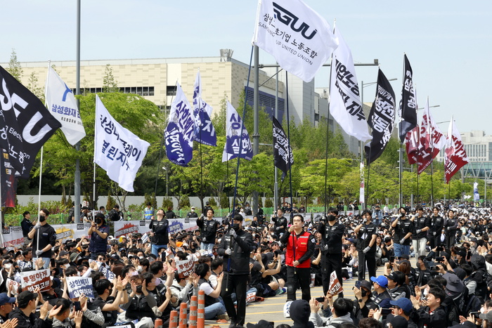 23일 경기 평택시 삼성전자 평택캠퍼스 앞에서 열린 삼성전자 노동조합 투쟁 결의대회에서 조합원들이 회사의 영업이익 15% 성과급 지급, 성과급 상한제 폐지 등을 요구하는 구호를 외치고 있다. 이날 오후 1시부터 진행된 결의대회에는 경찰 추산 3만여명, 노조 추산 3만9천여명이 참여했다.