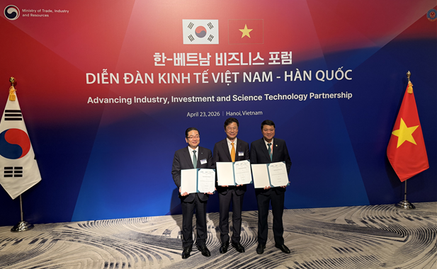 | 지난 23일에 개최된 한-베트남 비즈니스 포럼에서 KIND-BIDV-하나은행이 업무협약을 했다. /사진: 한국해외인프라도시개발지원공사(KIND) 제공 |