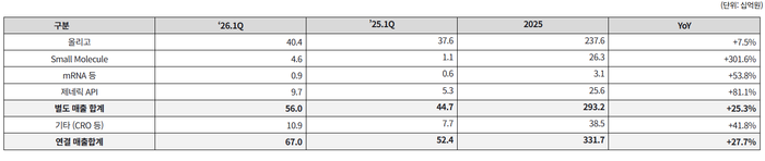 저분자 의약품 매출은 46억원으로 전년 대비 301.6% 증가했다. 올해는 2건의 프로젝트에서 상업화 물량 수요가 본격화되며 성장세가 이어질 전망이다. 해당 부문 수주잔고는 약 800억원 수준이다.