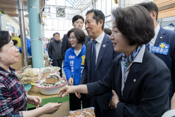 | 더불어민주당 정청래 대표와 추미애 경기도지사 후보, 김보라 안성시장 후보가 27일 경기도 안성에서 최고위원회의를 마치고 안성맞춤시장을 방문해 상인과 인사하고 있다./사진:연합 |