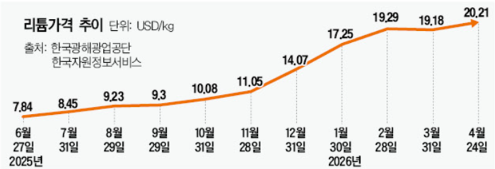 탄산리튬 ㎏당 20달러 돌파, 전년比 111% 폭등… 재고 손실 털고 판가 상승 ‘호재’