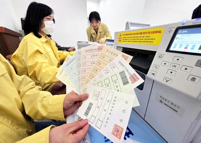 | 지난 28일 제9회 전국동시지방선거 사전투표(5.29)를 앞두고 광주 북구 용봉동 행정복지센터 투표관리관들이 전남대학교 컨벤션홀 사전투표소에서 투표용지 출력 등 1차 모의시험을 하고 있다./사진:광주 북구 제공 |